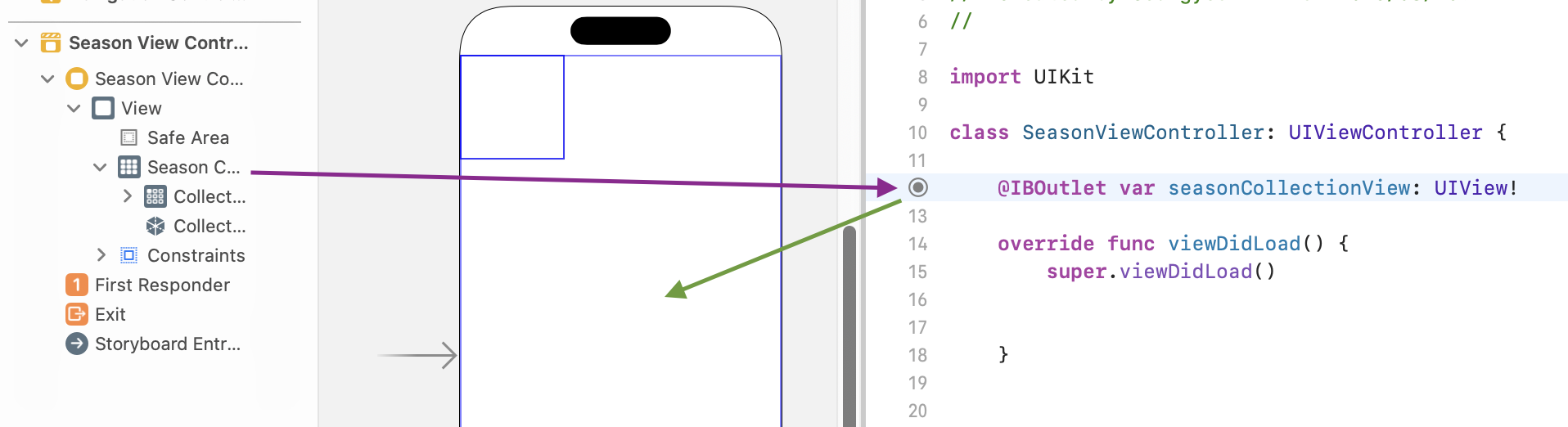 (실패): 먼저, 스토리보드에서 collectionView를 ViewController로 직접 드래그하여 아웃렛 연결을 시도했다. 하지만 이래 이미지처럼 시도해도 여전히 동일한 오류가 발생하며 연결되지 않았다. 이는 Xcode 내부의 인덱싱 문제일 가능성이 높다고 판단했다. - 코드로 @IBOutlet 직접 선언 후 역연결 (해결!): 정상적인 아웃렛 연결이 어려운 경우, 반대로 코드를 먼저 작성하고 스토리보드에서 연결하는 방식을 시도할 수 있다. ViewController 코드 내에 다음과 같이 @IBOutlet을 직접 작성하여 선언했다.