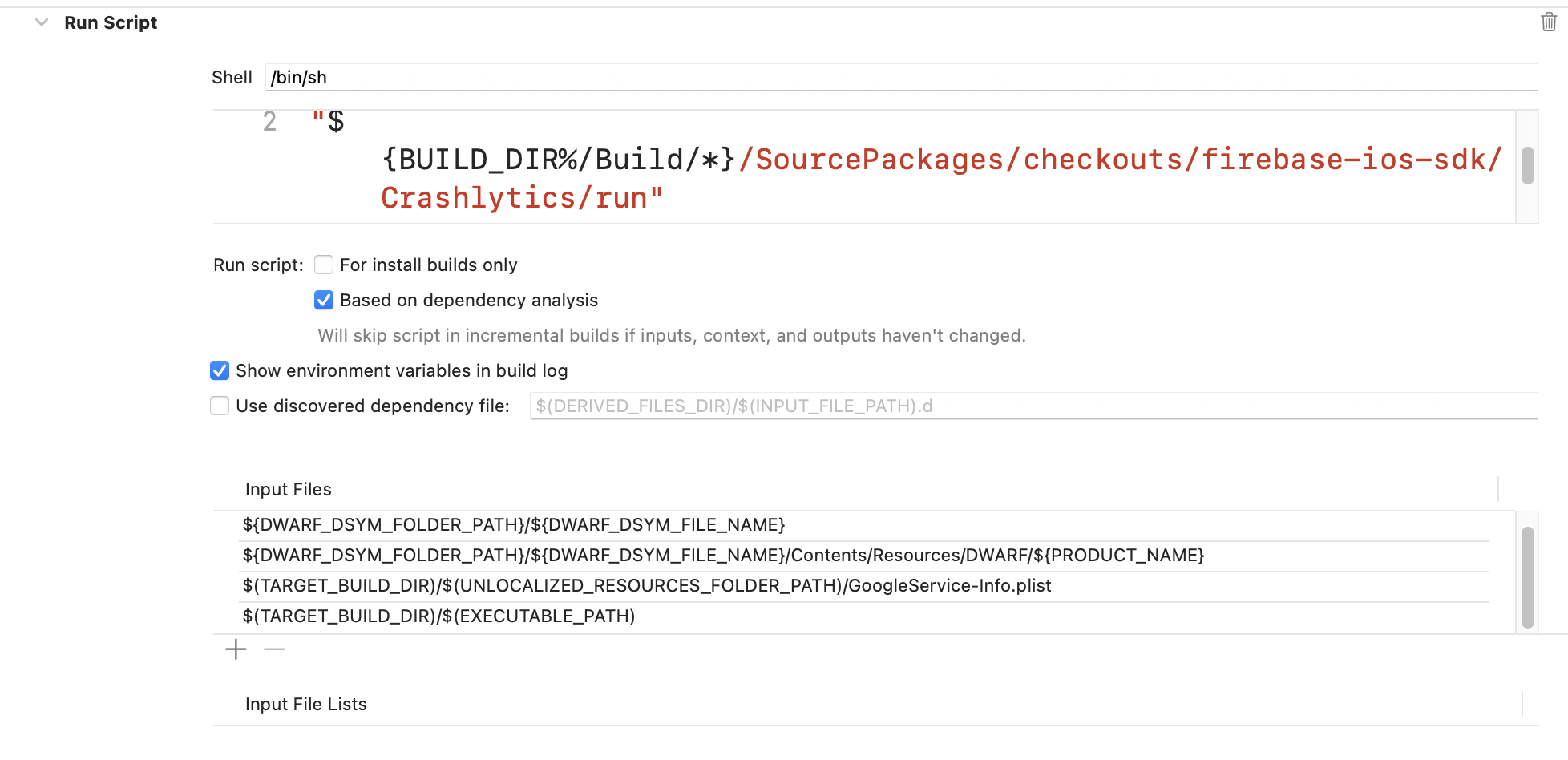 문제를 해결하기 위해 [Run Script] - [Input Files] 섹션을 살펴보았다. Run Script를 추가할 때, 기존에 있던 $(SRCROOT)/newInputFile 경로에서 $(SRCROOT)/를 제거하지 않고 Firebase Input Files 경로를 그대로 붙여 넣은 것을 발견했다.
