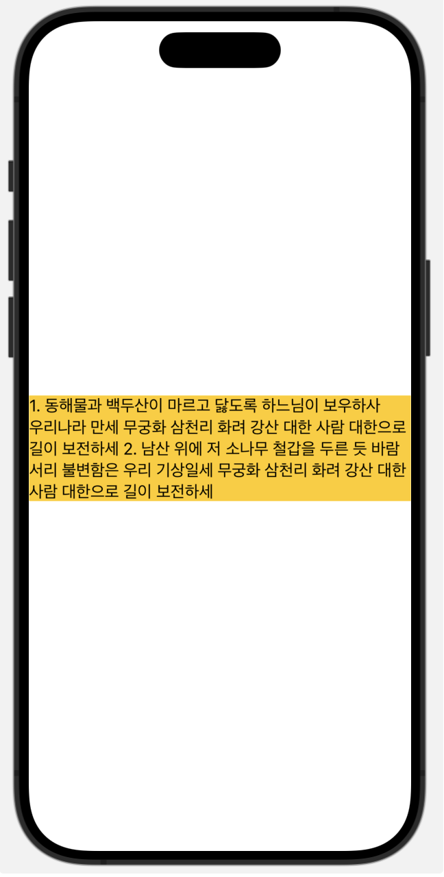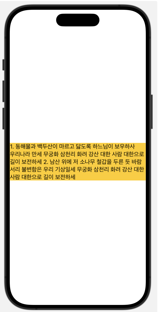 Text("1. 동해물과 백두산이 마르고 닳도록 하느님이 보우하사 우리나라 만세 무궁화 삼천리 화려 강산 대한 사람 대한으로 길이 보전하세 2. 남산 위에 저 소나무 철갑을 두른 듯 바람 서리 불변함은 우리 기상일세 무궁화 삼천리 화려 강산 대한 사람 대한으로 길이 보전하세")
