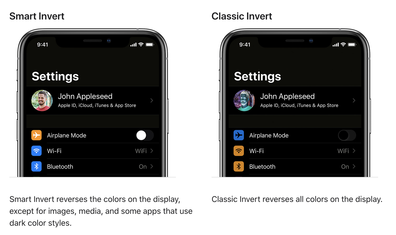 - Smart Invert 적용 확인: Smart Invert 기능을 사용했을 때 해당 색상 적용이 되어야 하는 대상에 맞게 올바르게 되는지 확인해야 한다. (사진, 영상, 앱 아이콘 등은 색상 반전이 되어서는 안 된다.)
