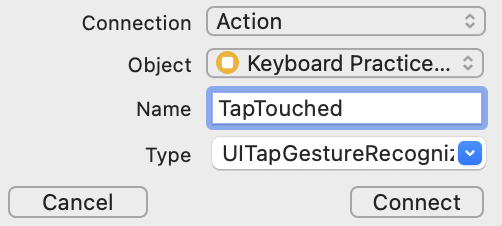 2. IBAction 연결: Tap Gesture Recognizer 아이콘을 IBAction을 생성하듯이 에디터 영역으로 드래그하여 함수를 생성한다. 이때 Type이 올바르게 설정되었는지 반드시 확인한다.