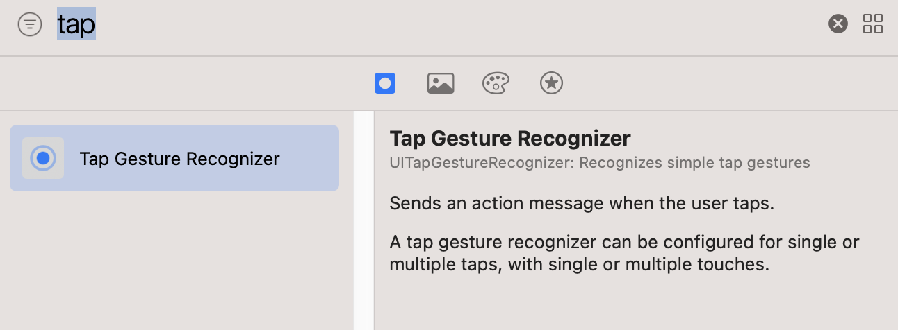 1. Tap Gesture Recognizer 추가: Xcode 라이브러리에서 Tap Gesture Recognizer를 검색하여 스토리보드의 빈 화면에 드래그하여 추가한다.