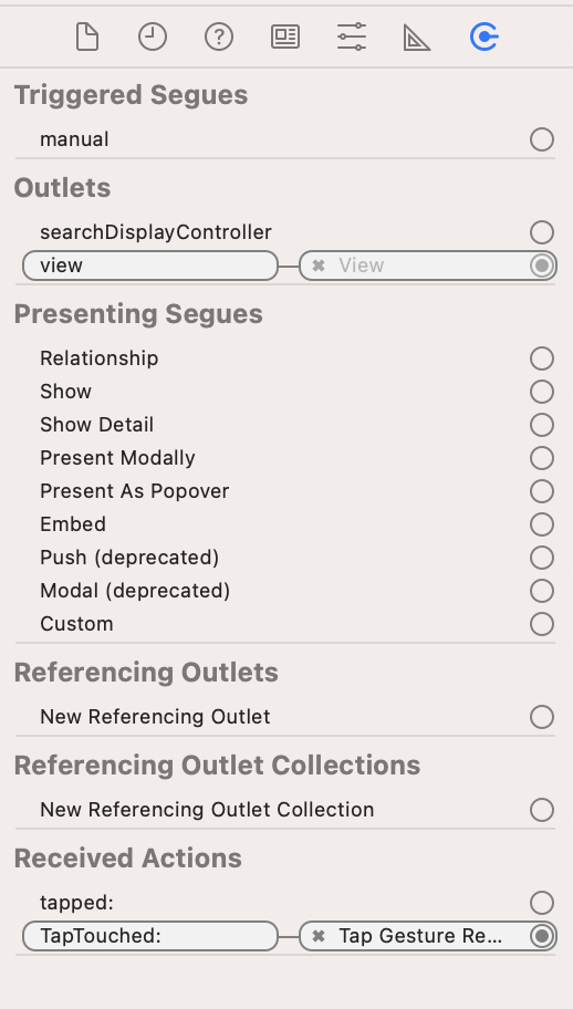Tip: 간혹 연결이 제대로 되지 않는 경우가 발생할 수 있다. 이때는 인스펙터(Inspector) 창의 Connections 탭에서 Tap Gesture Recognizer가 올바르게 연결되었는지 다시 한번 확인하는 것이 좋다.
